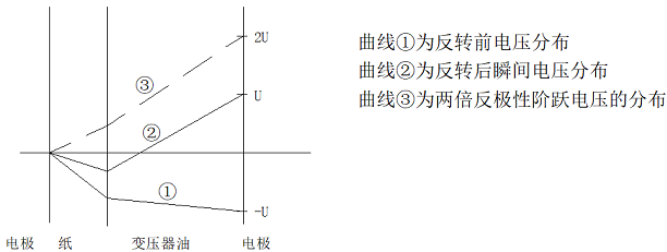 直流的極性反轉(zhuǎn)試驗可視為在穩(wěn)定的直流電壓作用下,突然施加兩倍的反向直流電壓,此時,電場分布為直流電壓下的分布與兩倍反極性階躍電壓下的分布的疊加,變壓器油中的場強(qiáng)出現(xiàn)最大值,并很快衰減至穩(wěn)定直流電壓作用下的場強(qiáng),而紙板中的場強(qiáng)則低于其穩(wěn)定直流電壓作用下的場強(qiáng)。電壓分布見圖1-20。