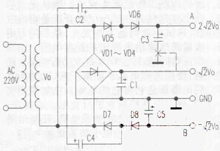 如附圖所示。圖中的A點(diǎn),可以獲得比主電壓高一倍的正電壓;而B點(diǎn)可獲得與主電壓同樣大小的負(fù)電壓,它們都利用了倍壓整流原理。對(duì)于A點(diǎn)輸出,當(dāng)變壓器次級(jí)上端為正時(shí),通過VD5對(duì)C2充電,當(dāng)次級(jí)上端為負(fù)時(shí),次級(jí)電壓與C2上電壓串聯(lián)起來經(jīng)過VD6對(duì)C3充電,結(jié)果在c3上可得到2*根2*Vo的半波整流電壓。對(duì)于B點(diǎn)輸出,當(dāng)次級(jí)上端為正時(shí),C4通過D7充電,當(dāng)次級(jí)上端為負(fù)時(shí),C4與次級(jí)串聯(lián)起來通過VD8和C1為C5充電,結(jié)果在C5上得到大小為3*根2*Vo的半波整流負(fù)電壓,A點(diǎn)和B點(diǎn)之間還可得到3*根2*Vo的電壓,按圖中虛線所示連接C3,可降低對(duì)C3的耐壓要求。