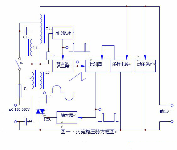 圖一是這種穩(wěn)壓器的方框圖, T1 為自耦變壓器,與鐵芯電感 L3 及雙向可控硅 SCR 串 聯(lián)之后接入市電,當(dāng)市電電壓或負(fù)載波動(dòng)引起輸出電壓變化時(shí),通過采樣電路、比較器及觸 發(fā)器控制雙向可控硅的導(dǎo)通角度,改變通過的電流,進(jìn)而改變補(bǔ)償電壓△U 的大小及相位, 從而達(dá)到穩(wěn)定輸出電壓的目的。L3 用來平滑可控硅通過的電流波形,L2、C2 組成三次諧波 串聯(lián)揩振支路,L1、C1 組成五次諧波串聯(lián)諧振支路,用來濾出高次諧波改善電流及輸出電 壓波形。為了防止穩(wěn)壓電源失控出現(xiàn)的高壓,電路中還設(shè)置了輸出過壓保護(hù)電路,通過繼電 器 J 切斷回路對(duì)負(fù)載實(shí)現(xiàn)保護(hù)。