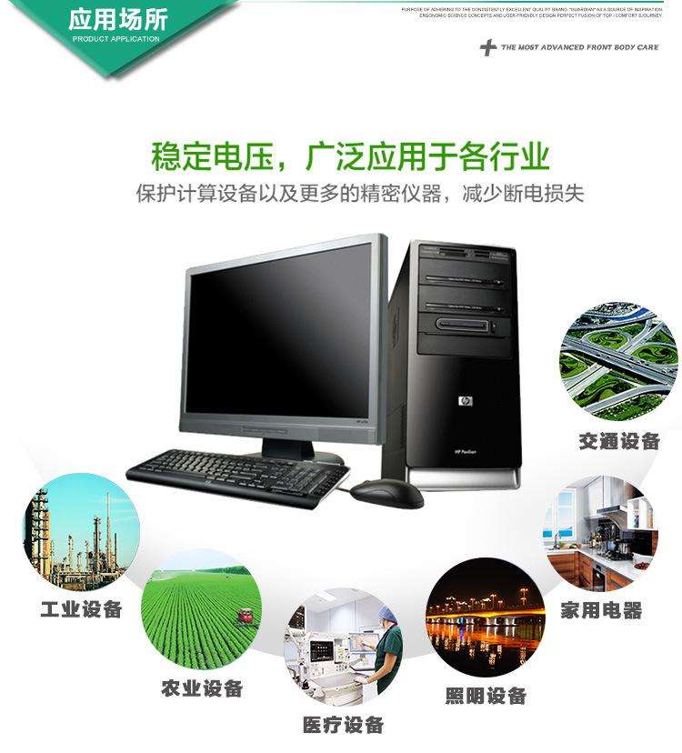 計算機(jī)行業(yè)、測試設(shè)備、照明系統(tǒng)、通訊系統(tǒng)、醫(yī)療設(shè)備、工業(yè)自動化設(shè)備、 音響 設(shè)備等用電場所,工礦企業(yè)、油田、鐵路、建筑工地、家用、學(xué)校、 醫(yī)院 、郵電、 賓館 、科研等部 門 的電子計算機(jī)、精密機(jī) 床 、計算機(jī)斷層掃描攝影(CT)、精密儀器、試驗裝置、 電梯 照明、進(jìn)口設(shè)備及生產(chǎn)流水線等需要電源穩(wěn)定電壓的場所。