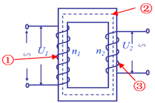變壓器的結構簡圖如下圖所示,主要包過三個:①原線圈(初級線圈)、②閉合鐵芯、③副線圈(次級線圈)。