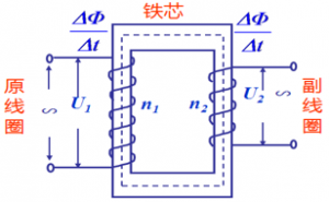 當原線圈通有交流電,會在鐵芯內產生變化的磁場,副線圈處在鐵芯的磁場內,將產生感應電流(互感現(xiàn)象),原副線圈的磁場變化情況是一樣的,所以原副線圈的ΔΦ/Δt相同(忽略磁場能損失)。